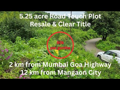 Road-touch clear-title resale land available at a reasonable price!\r\n\r\nš Land Details:\r\nTotal Area: 5.25 Acres\r\nFrontage: 100+ meters wide on main road\r\nLocation: Just 2 km from Mumbai-Goa Highway & 12 km from Mangaon city\r\nTaluka: Mangaon, District: Raigad\r\n\r\nšļø Land Highlights:\r\nRoad-touch plot at the base of a scenic hill with a slight natural slope\r\nSerene view of surrounding nature from the land\r\nAgricultural land currently, but adjacent to Gaothan area ā eligible for NA (Non-Agricultural) conversion anytime\r\nStone compound on the roadside and thorny fencing at the rear\r\nAn old house structure previously existed (collapsed in storm), but assessment record is still active ā no new building permission needed\r\nElectricity and water connections already taken on paper\r\n\r\nā